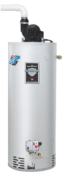 ■ Power vented for positive exhaust during main burner operation—the TTW1 uses a specially designed assembly that blows exhaust gases directly out of the building, eliminating the need for conventional chimneys or expensive flue systems. ■ Optional Blower Orientation—blower/motor assembly can be rotated to allow for direct horizontal discharge of exhaust gases. ■ Electronic ignition system—electronic ignition eliminates the constant burning pilot used on other water heaters. This device results in savings of pilot gas during standby periods. (115V AC required to heater) Ignition system operates off of 24 volts. ■ 2″ PVC, ABS & CPVC (51 mm) vent—the water heater can be vented horizontally with 2″ PVC, ABS & CPVC (51mm) for lengths up to 30 feet (9m) with (3) 90° elbows. (45 equivalent feet) (13.5m). ■ 3″ PVC, ABS & CPVC (76 mm) vent—can be vented horizontally with 3″ PVC, ABS & CPVC (76mm) for lengths up to 90 feet (27.4m) with (3) 90° elbows. (105 equivalent feet) (32m). ■ Vertical venting through the roof—the water heater can be vented through the roof at a vertical height of 22 feet (6.7m) when using 2″ PVC, ABS & CPVC (51mm) and 40 feet (12m) when using 3″ PVC, ABS & CPVC (76mm). ■ Vitraglas® lining—Bradford White water heater tanks are protected from the corrosive effects of hot water by an exclusive ceramic porcelain-like coating. The Bradford White high silica Vitraglas® lining provides a tough interior surface for our hot water tanks. ■ Protective magnesium rod—provides added protection against corrosion for long trouble-free service. ■ Factory installed Hydrojet® Total Performance System—cold inlet sediment reducing device. Helps prevent sediment build up in tank. Increases first hour delivery of hot water while minimizing temperature build up at top of tank. ■ Heat Traps—factory installed, minimizes heat loss through piping. ■ Water Connections—3/4″NPT factory installed true dielectric fittings. Extends water heater life and eases installation. ■ 1″ Non-CFC foam insulation—covers the sides and top of tank to save energy by retarding loss of heat. Also increases jacket rigidity. ■ Fully automatic controls—fast acting surface-mount thermostat for automatic temperature control. Built-in energy cut-off switch prevents abnormally high water temperature for extra safety. Combination gas valve has built-in gas pressure regulation and operates off of a 24 volt circuit. ■ Brass drain valve ■ T&P relief valve included ■ Flue baffle—designed to maximize the amount of heat absorbed in the lower portion of tank. Reduces air movement in the water heater during standby periods to retard heat loss up the flue. ■ Six or ten year limited warranty on steel tank—heavy gauge steel automatically formed, rolled and welded to assure a continuous seam for glass lining. ■ Six year limited warranty on parts